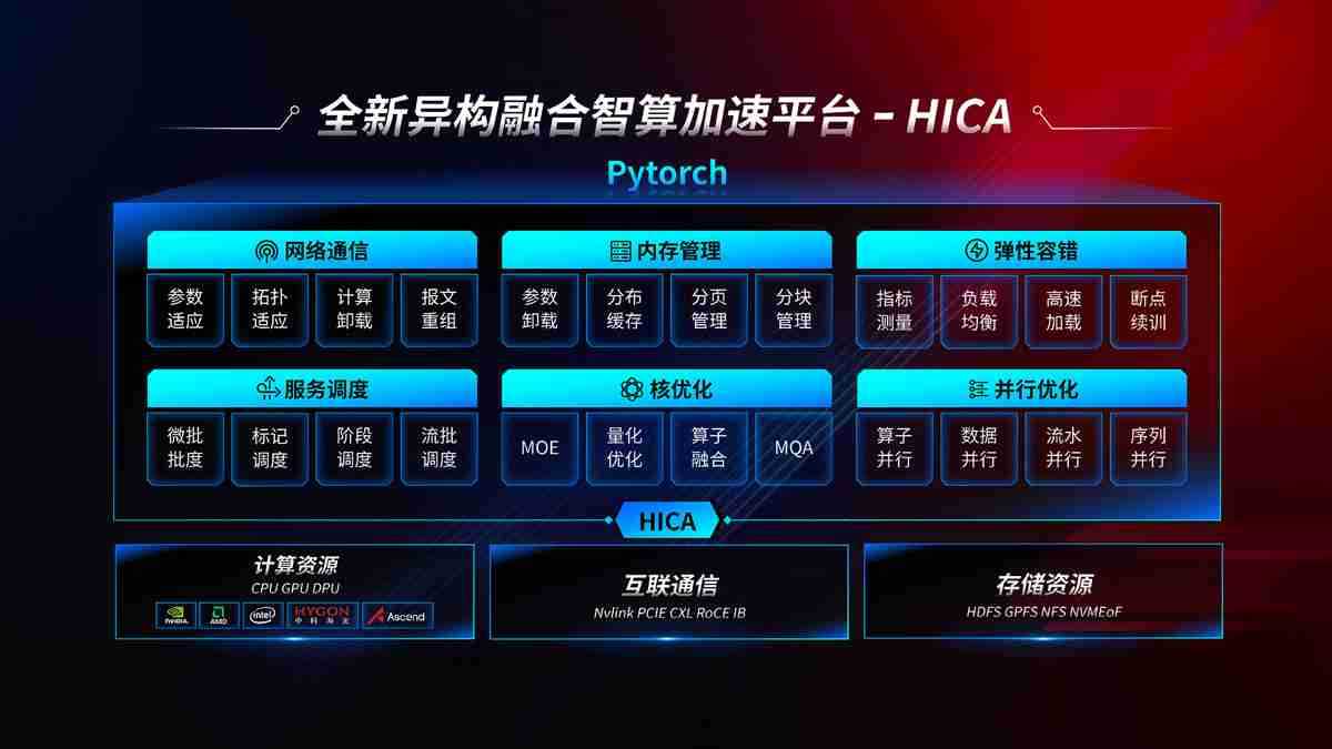 通过自研的服务层、、中间适配层、、以及调度编排算法,,,采用数据并行、、、模型并行等多种并行方式,,,把并行计算任务进行有效的分解,,使其分别由相应的软件栈和算力资源来承接。。当GPU资源变化,,HICA可以实时动态调度计算子任务并调整模型拓扑和架构,,,以充分聚合各种算力资源。。
