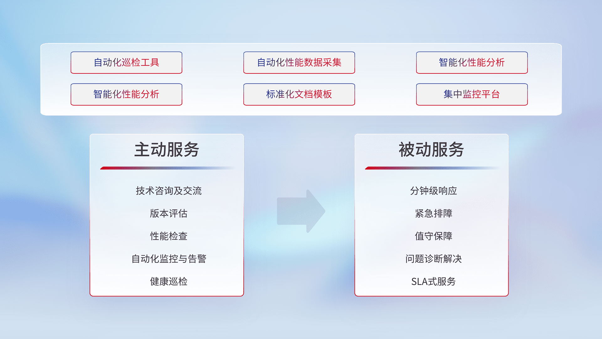 智能化工具和标准化文档,,,保障服务质量,,,提供主动服务(包含技术咨询、、、、版本评估、、、、性能检查、、、、自动化监控与告警、、、健康巡检)和被动服务包含(分钟级响应、、、紧急排障、、、值守保障、、、、问题诊断解决、、、SLA服务)。。。