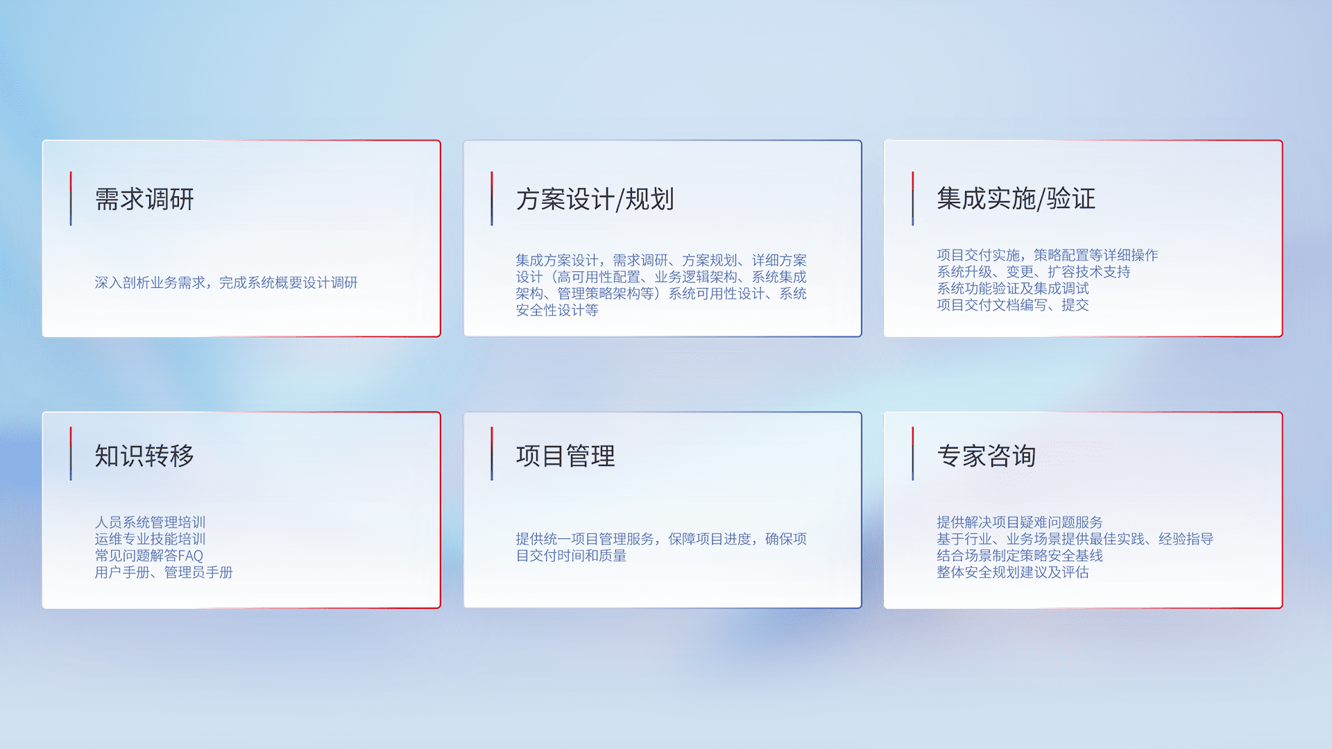 针对客户行业特性,,,将宏观的安全战略和需求,,,,通过专业的交付服务,,,,实现项目落地,,为客户提供标准规范的集成交付服务。。